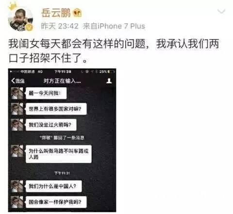 因为这件事我突然想起一个关于岳云鹏和妻子郑敏的故事。有一次小岳岳回家对媳妇说:“我现在这么红,为什么在高峰前面出场。”结果媳妇给了他一巴掌:“你疯了吧!”岳云鹏把这事给郭德纲说了,郭德纲说:“你这是摊上好媳妇了!”