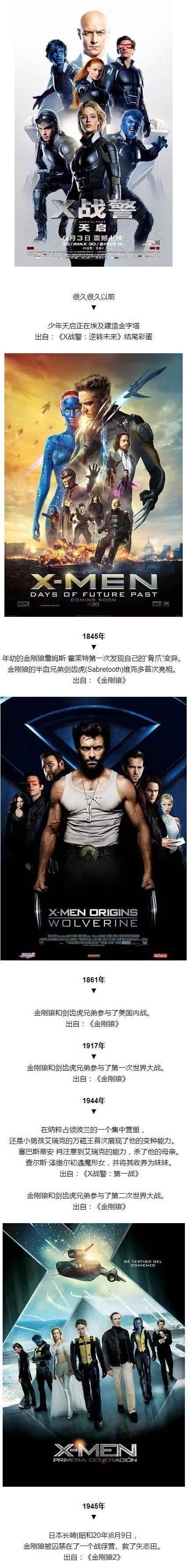 《金刚狼》→《X战警:第一战》→《X战警:逆转未来》→《X战警:天启》→《金刚狼》→《X战警》 →《X战警2》 →《X战警3:背水一战》→《金刚狼2》 →《X战警:逆转未来》→《X战警:天启》→《金刚狼3》