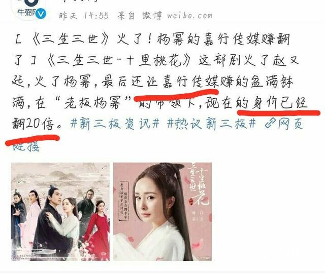 随着《三生三世十里桃花》的热播,杨幂的嘉行传媒简直是赚钱赚到手软啊,杨幂自己就更不用说了,嘉行传媒的身价已经翻了20倍,可想而知大幂幂的身价将会上涨到多少,说是第一也不为过了吧~~
