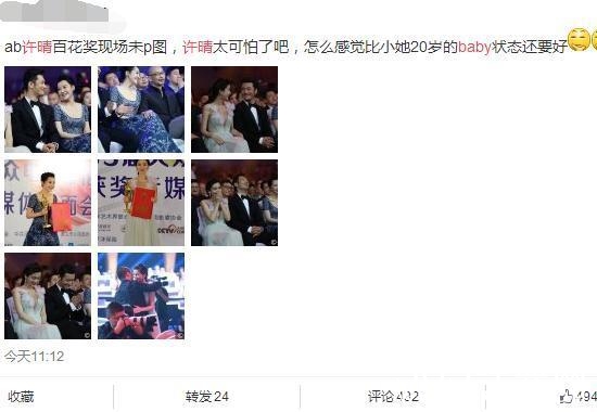 此外,女神同台,自然也有人喜欢比拟,于是比美开端,结果,不断被称美得无死角的27岁的baby竟然被网友断定输给了47岁的许晴,网上一阵对许晴容貌的赞誉。