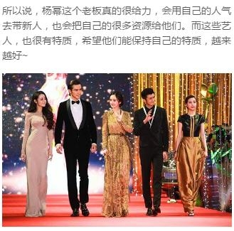 杨幂很有智慧,她知道在娱乐圈是不能靠着一张会老去的脸混一辈子的。于是她早在几年前就开了自己的工作室,自立门户了,还签了很多新人。而由她带的新人,短短几年时间,几乎个个都红了!