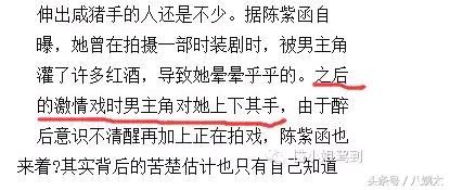 其实发生最多“性骚扰”的地方就是片场,尤其是拍激情戏的时候,有些无道德男演员会趁机吃豆腐,然而作为旁观者你很难判断这究竟是在工作还是在趁势吃豆腐。陈紫函就曾经自曝在拍一部时装剧时,就遭到对手演员刻意灌醉她,并对她上下其手开始抚摸亲吻,因为职业素养,她只得忍到拍完。