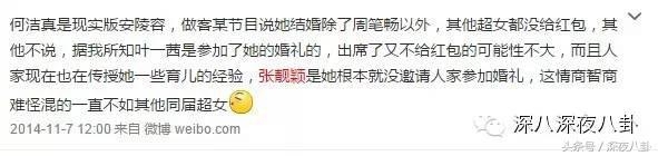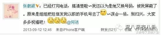 然后张靓颖呢,说是发到人家的旧手机号码上了。。。人家是肯定收不到啊。。。张后来还发了微博,表示何洁是有请她的