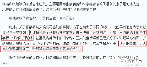 天涯有爆料说,本来都已经确定李宇春、周笔畅、何洁进前三,但比赛当天张靓颖用跟天娱签约五年做交换,天娱就让张进前三