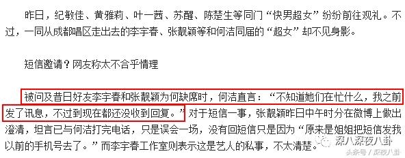 之后大家各自发展就很少联系咯,她们再有交集,就是何洁结婚那次,在媒体面前说喊了李宇春张靓颖但她们都不来什么的。。。。