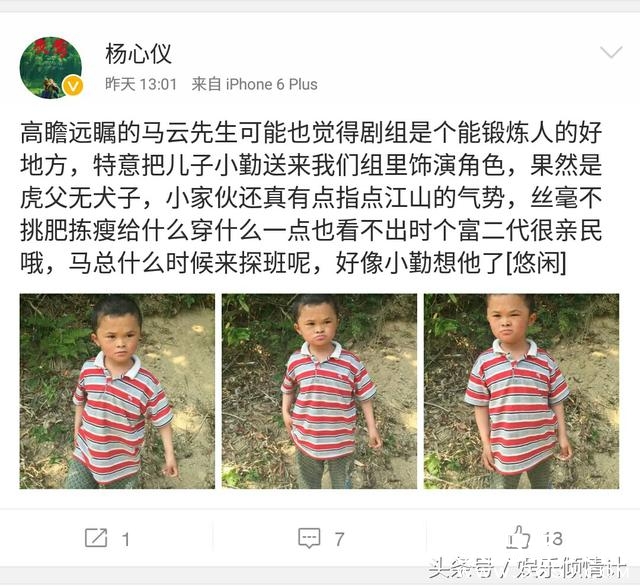 从照片上看,范小勤似乎胖了不少,皮肤也没以前那么黝黑了,或许这是被曝光走红后生活变好的缘故吧,即便如此不过看起来依然霸气十足。大家说有木有?如此说来,加上这部戏“小马”云截止至今已经参演了两部影视剧,不得不说这个孩子是多么幸运,遇到马老师这样的贵人,祝福这孩子,希望这个孩子能成为国家栋梁之财,也希望媒体朋友不要打扰,让他健康快乐的成长,加油小马云范小勤!!!