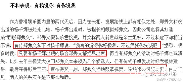 但事实上郑秀文很不满意杨千嬅借着自己名头走红,有传她私下吐槽杨减了肥才像她。。。只要有杨千嬅出现她都尽量不出席
