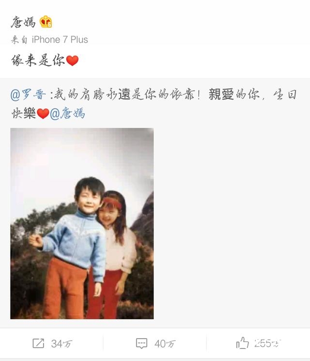 唐嫣和罗晋微博公布恋情时,罗晋用ps将他们小时候的照片p在一起,就像很久之前就认识一样!很暖心!缘来是你!也让人感受到了他们的甜蜜!
