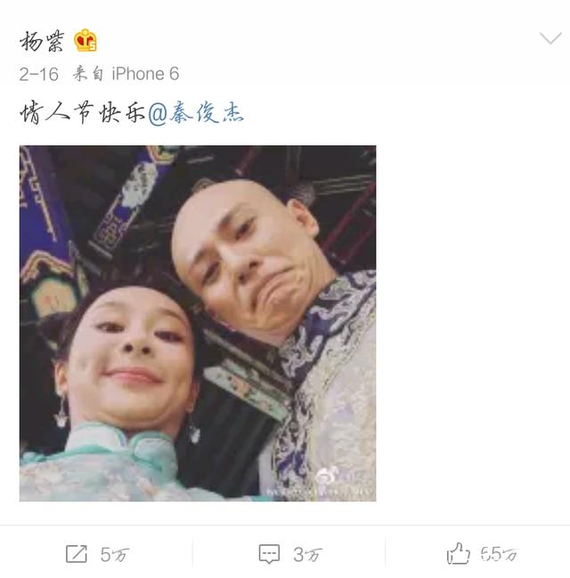 杨紫和秦俊杰,杨紫发出的是两人在拍摄现场拍的搞怪照,祝对方情人节快乐公布恋情,这样自黑的方式,也只有杨紫这样搞怪的人才能想出来咯!