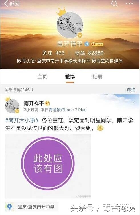随后,南开中学校长还发微博调侃:“各位童鞋,淡定面对明星同学,南开学生不是没见过世面的傻大哥、傻大姐。”