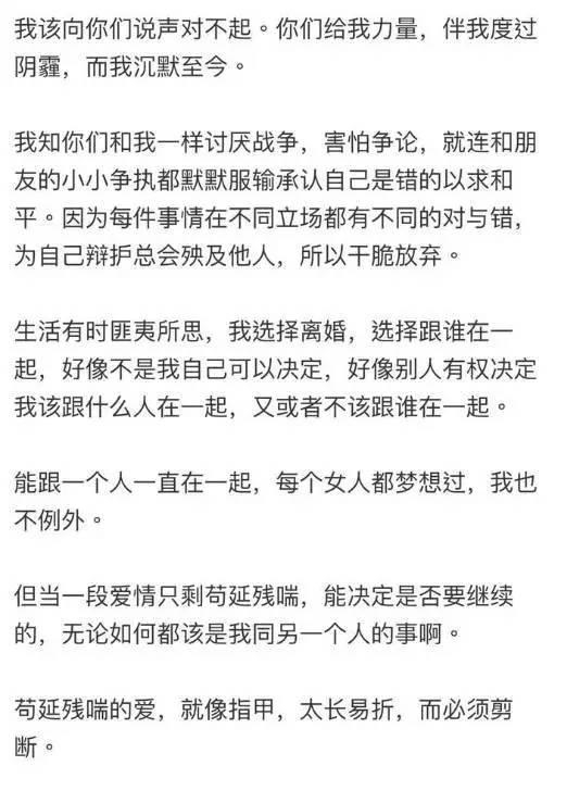 第二次,去年8月30日,张子萱删掉了自己的所有微博,发布了一篇长文,表示“当一段爱情只剩苟延残喘,能决定是否要继续的,无论如何都该是我同另一个人的事啊。”