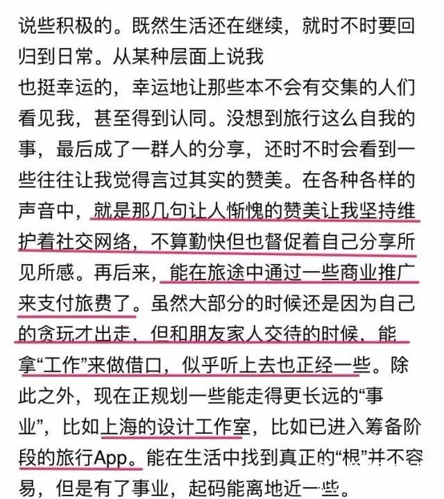 对于旅游费用质疑,她只说现在可以接一些商业推广(打小广告)来解决花销。她时不时写游记,在社交平台上和大家分享,是因为网友的赞美。