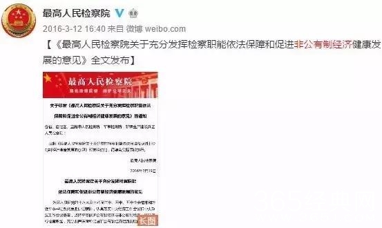2016年3月,最高检印发《最高人民检察院关于充分发挥检察职能依法保障和促进非公有制经济健康发展的意见》,共计18条意见。
