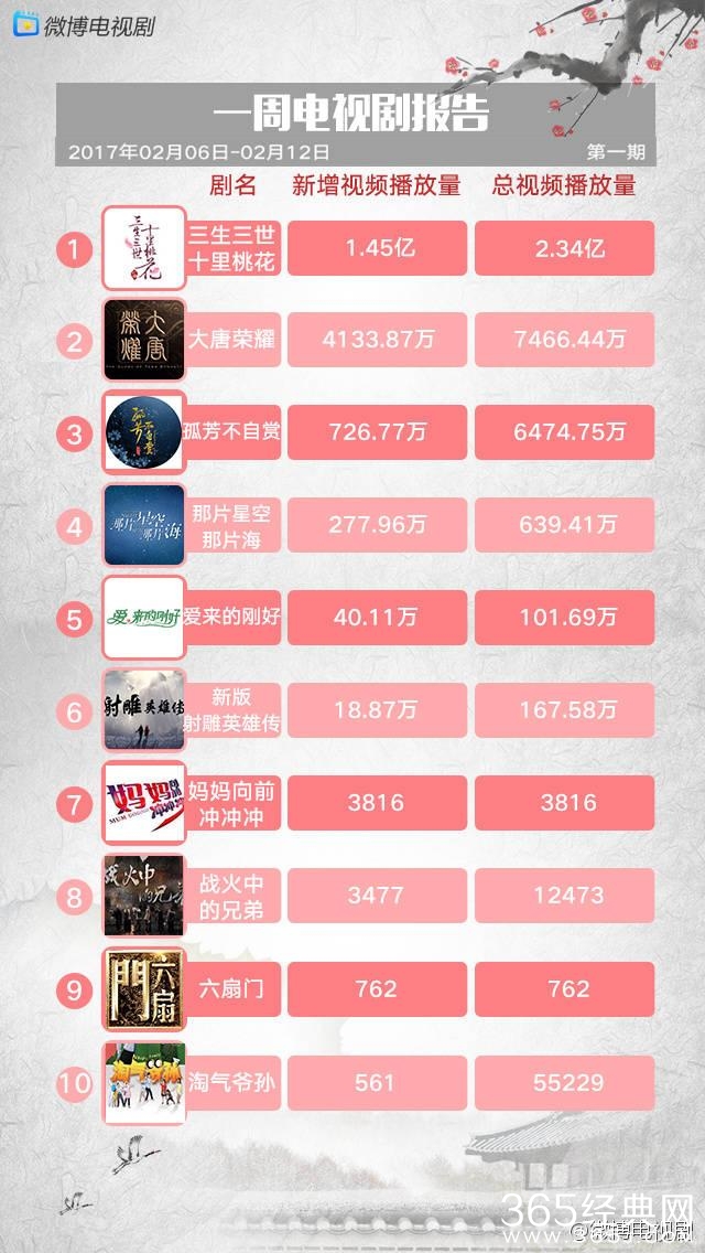 今天某微博曝光了近期热门电视剧全网播放总量,其中《三生三世十里桃花》的总播放量达2.34亿稳居第一,收视率浙江、东方双台破一。由景甜主演的《大唐荣耀》以7466.44万的总播放量位居第二,由郭碧婷、冯绍峰主演的《那片星空那片海》第四。