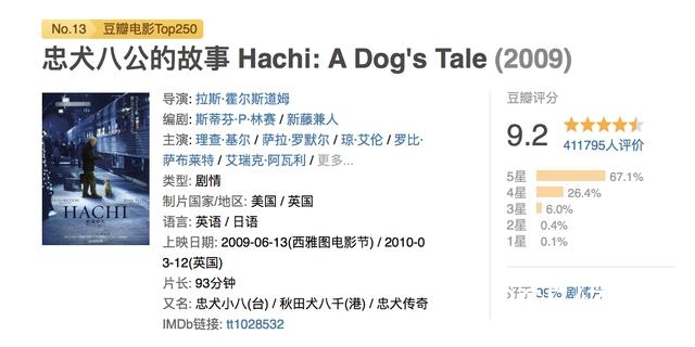 《忠犬八公》是动物类题材的巅峰之作,据真实事件改编,日版《忠犬八公物语》,是1987年日本票房冠军,美版的《忠犬八公》豆瓣全球排名13名,评分9.2。