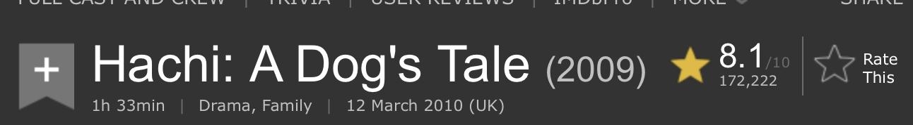 都是表达狗的一生只有一位主人,《一条狗的使命》是以轮回的超现实方式讲述,《忠犬八公》是以用余生等待的方式讲述,大概是后者取材于生活,更深得人心,每每想起hachi在车站等待那个永远不会出现的主人,我他妈就不争气地哭了。