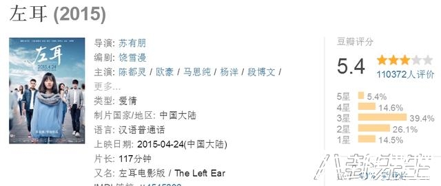 看赵薇执导得如此成功,苏有朋的导演心估计被燃烧起来了,所以导出了部《左耳》。但评分显然没有赵薇的高,只有5.4分▼