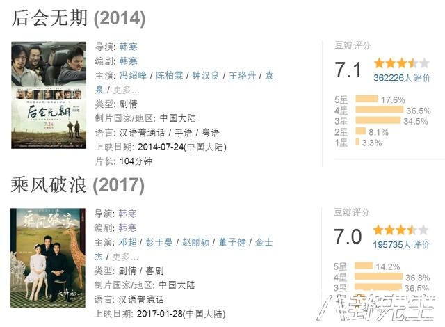 韩寒的电影都是偏文艺的,豆瓣评分在国产电影里算高了,但评价也比较两极化▼