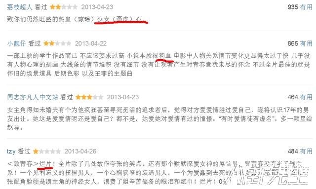 赵薇的演技也不错,她执导的《致我们终将逝去的青春》除了片名能引起共鸣之外,故事都是脱离现实的。看点赞排名前几的评论,不乏“烂片”、“狗血”等字眼▼
