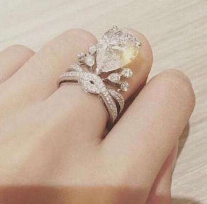 据悉,Angelababy手上的钻戒价格不斐,除了正中间镶有1颗5.53克拉梨形钻石外,周边还细细镶上73颗小碎钻。看得出来黄晓明对baby有多么的宠爱了吧~