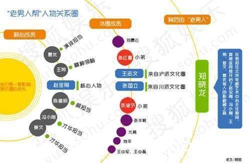 王朔这条线衍生出的关系链前期是冯小刚、张元,后来主要人物就是徐静蕾;冯小刚衍生出来的就是华谊兄弟王中军和王中磊以及姜文,由姜文又衍生出何平导演,耿乐,张一白。郑晓龙这条线衍生出来的是赵宝刚和葛优;赵宝刚衍生出来的下线就是作家石康而石康衍生出来的就是王珞丹。