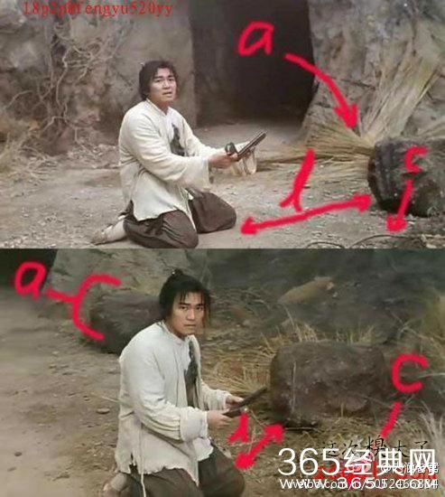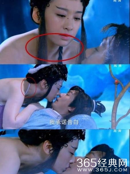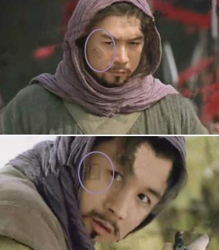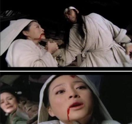【新水浒传】中潘金莲的胸口上被武松扎了一刀,注意金莲下巴的血痕流向,明明已经流到脖子上的鲜血,下个镜头时,口中鲜血却才流到嘴角而已。