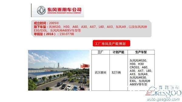 东风汽车集团股份有限公司乘用车公司位于武汉经济技术开发区,是东风汽车公司全资组建的集制造、销售东风自主品牌乘用车的事业单元,东风自主乘用车事业肇端于2005年7月。2007年7月25日,东风乘用车事业部暨事业部党委作为东风汽车公司新兴事业单元挂牌成立。目前东风乘用车公司已投产并上市东风风神S30、H30、H30 CROSS、A60、A30、AX7、L60、AX3和东风A9等系列车型,以及新能源车型东风风神E30、E30L、东风风神A60EV车型。