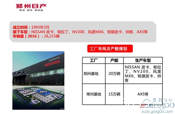 郑州日产汽车有限公司成立于1993年3月,是东风与日产合资的整车制造企业。其中,东风汽车股份有限公司拥有股份51%、东风汽车有限公司拥有股份28.651%、日本国日产自动车株式会社拥有股份20.349%。郑州日产共有NISSAN、东风两个品牌、三个汽车品类、六大车型,其中NISSAN品牌包括NISSAN 皮卡、帕拉丁SUV及CDV车型NV200,东风品牌包括城东风风度城市SUV MX6、帅客高级紧凑型商务车、锐骐皮卡及其多功能车,多年来稳居国内皮卡市场前三位,是国内LCV(轻型商用车)产品覆盖最全的企业之一。目前郑州日产拥有两座基地,分别产能为20万辆、15万辆。