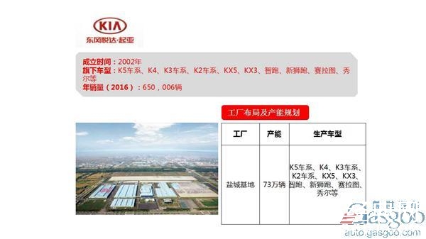 东风悦达起亚汽车有限公司系由东风汽车公司、江苏悦达投资股份有限公司、韩国起亚自动车株式会社共同组建的中外合资轿车制造企业。目前在江苏盐城建立了三个生产基地,年计划产能在73万辆。主产品K3车系、K2车系、K5车系、智跑、SOUL秀尔、福瑞迪、赛拉图、RIO锐欧、狮跑系列车型等