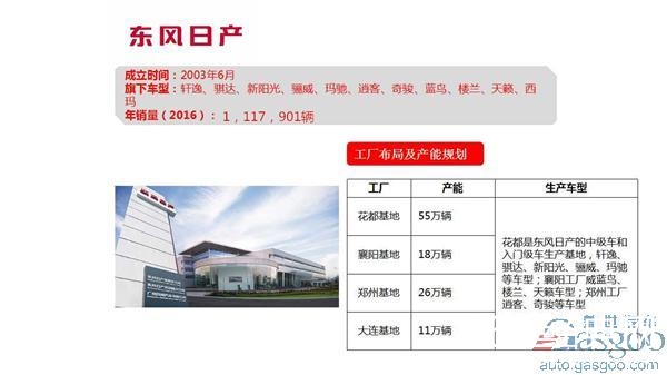 东风日产乘用车公司(原名为东风汽车有限公司乘用车公司)成立于2003年6月16日,位于广州花都。东风日产乘用车公司以广州风神汽车有限公司为基础,是东风汽车有限公司最具发展潜力的重要组成部分。东风日产目前已形成花都、襄阳、郑州和大连四大基地纵贯南北、各有侧重的战略布局,总部花都工厂作为母工厂,着力于入门级、中级轿车的生产,打造规模化生产工厂;襄阳工厂作为品质标杆工厂,以生产高端车型为主,并计划于2014年开始生产英菲尼迪品牌车型;郑州工厂主导NISSAN品牌SUV车型和启辰品牌车型的生产;大连工厂计划于2014年开始投产NISSAN品牌车型。(现启辰品牌已经成立独立汽车公司)