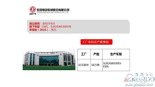公司成立于2001年9月,位于国家级开发区——湖北省武汉经济技术开发区内。作为东风公司电动汽车研发与产业化的平台,东风电动车公司已成功跨越创立初期以研发为主的阶段,步入以生产和商业推广为主的产业化阶段。按东风汽车公司节能与新能源汽车战略部署,公司形成了以纯电动乘用车产业化和新能源汽车核心零部件产业化业务为核心的产业布局。目前在武汉拥有一座生产基地,年计划产能为16万辆,其生产车型为东风风神S30EV、E30L等。