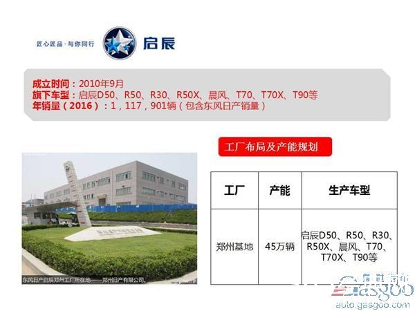 2010年9月8日,东风日产正式发布自主品牌“启辰”,2016年底“启辰”品牌在未来将与东风日产脱离,成立独立公司。目前旗下乘用车车型有启辰D50、R50车系、R30、T70车系、晨风、T90等。目前东风汽车在郑州拥有制造基地,年计划产能为45万辆。