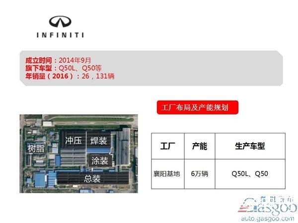 东风英菲尼迪公司成立于2014年9月,目前在襄阳拥有生产基地,年计划产能为6万辆,主要生产车型为Q50、Q50L。