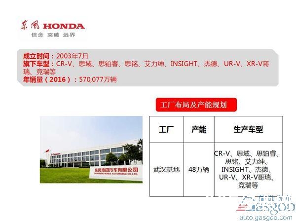 东风本田汽车有限公司是由东风汽车集团股份有限公司出资50%、本田技研工业(中国)投资有限公司出资10%、日本本田技研工业株式会社出资40%共同组建的整车生产经营企业。公司成立于2003年7月16日,注册资本5.6亿美元,公司拥有员工超过7000人,目前共有两个生产工厂,其中一工厂占地面积69万平方米,建筑面积31万平方米,二工厂占地面积105万平方米,建筑面积35万平方米。公司拥有具备强大研发技术力量的研究开发中心,以及冲压、焊装、合成树脂、涂装、发动机铸造、机械加工、发动机装配及汽车总装等先进工艺生产车间。目前两工厂均已投产年计划产能为48万辆,旗下车型为CR-V、思域、思铂睿、思铭、艾力绅、INSIGHT、杰德、UR-V、XR-V哥瑞、竞瑞等。