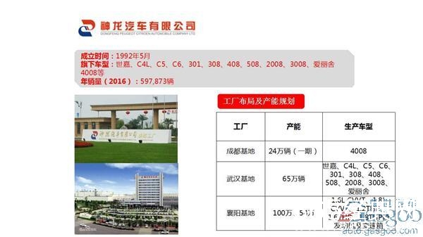 神龙汽车有限公司,1992年5月18日成立。2002年10月25日,由中国东风汽车公司与法国雪铁龙公司的合资合作提升为与法国PSA标致雪铁龙集团的合资合作,合资企业的中文名称不变。在基地产能方面,神龙汽车共有三座生产基地,其中成都基地位24万辆,主要生产PSA旗下的中高端SUV车型。武汉基地主要生产308、408、3008等车型;而襄阳基地为发动机、变速箱生产基地,目前年产发动机、变速箱分别为100万、54万。