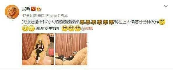昨晚,吴昕在微博晒了谢娜送的大熊,并配博:我娜姐送给我的大熊,躺在上面懒癌分分钟发作。