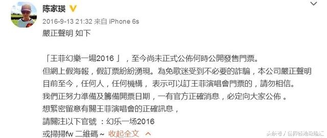 结果,谣言虽然解释了,可是正规票如何买,什么时间能抢,这些有用的信息犹如挤牙膏一样,不一次说全,被网友酸:老辟谣,就是没准信儿。好在后来,演唱会上王菲略失水准的表演,让大家的关注度都放在吐槽上了,于是忘记了和陈家瑛较真。
