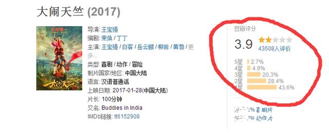 看看豆瓣,只给了这部影片3.9的评分。豆瓣评分的规则就是所有的用户都可以投票打分,然后算出平均分。大闹天竺豆瓣这个评分低不是豆瓣自己随意说底,而是万万千千消费者,粉丝说的底。