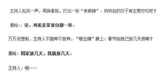 “傻狍子”鹿晗也加入了段子手的行列,在今年春晚后台的采访中,鹿晗就展现了自己段子手的才能