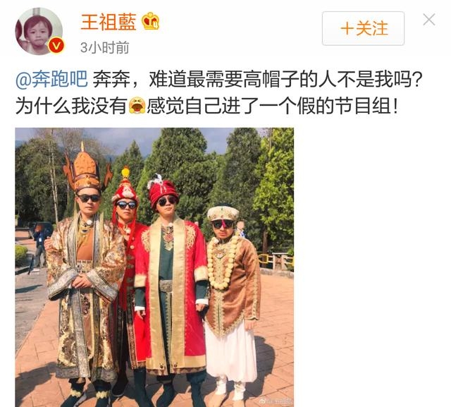 今天王祖蓝发微博:奔奔,难道最需要高帽子的不是我吗?为什么我没有,感觉进了一个假节目组!