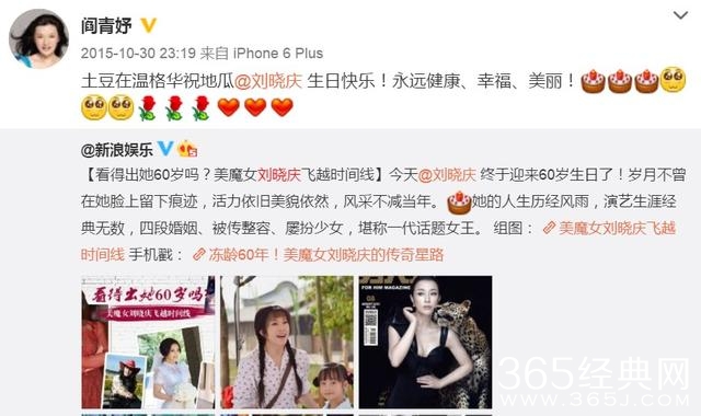 阎青妤不仅在微博上经常@刘晓庆,甚至给彼此取了小外号“刘地瓜”和“闫土豆”~
