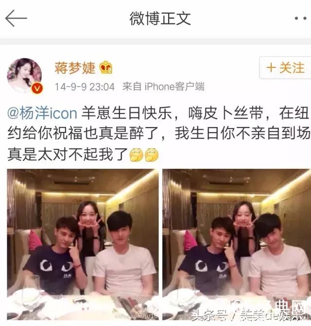 俩人私底下的关系也很不错,是老同学更是铁哥们,有着革命般的友谊,在杨洋生日时,蒋梦婕会在微博送上祝福。