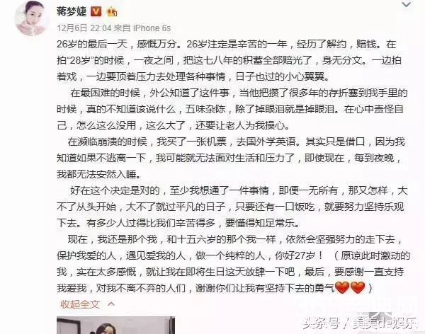 如此乐观的蒋梦婕在过27岁生日时在微博宣布了她和公司解约和赔偿的事情,一夜之间她变的一无所有。但她还是很乐观的面对和安慰自己从头开始,微博全文在下图,你们自己看!