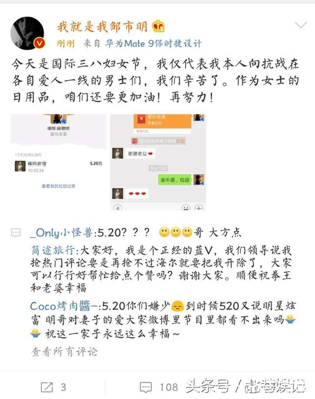 看看邹市明夫妇:在三八妇女节,在向全国女性送去祝福的时候,也不忘秀恩爱;不过,这样的狗粮我还是接受的,毕竟这样的秀恩爱方式我们还是玩的起的,说说你老公给你发了多大的红包?