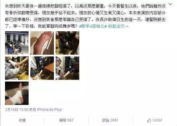 之前容祖儿参加我是歌手,彩排时不小心把脚扭伤了