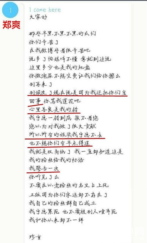 3月8日,有网友爆料,郑爽再次出来怼老粉,语出惊人“所有的颁奖我宁愿不去也不想你们有半点得逞”、“我就是双商低了,我一直都知道这是我的粉丝给我的标语”。