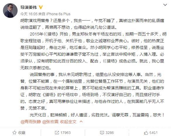 ,由胡歌主演的电视剧导演姜伟微博发文力挺胡歌,他表示电视剧开拍之时胡歌正当红,但他仍旧谦和有礼,而传说中的替身,他表示,“我从未见胡歌用过,组里也从没安排这等人事”,他还表示:“胡歌场场到场,不仅演好自己的,而且搭好对手的”。