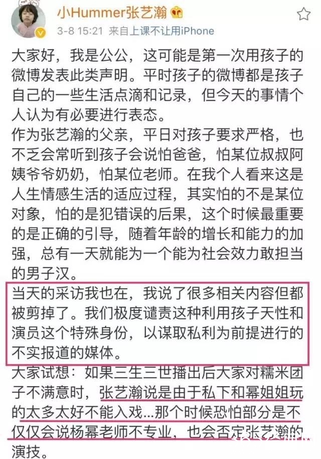 事情还没完,张艺瀚的爸爸又发了第二条微博,爸爸说当天他说的很多内容都被剪掉了,极度谴责媒体的这种行为。