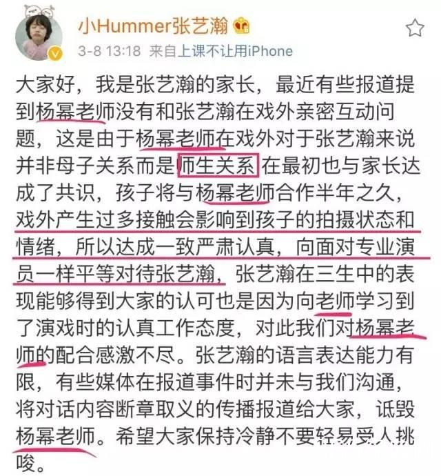 第一条微博把杨幂尊称为杨幂老师,声明张艺瀚和杨幂并非母子关系,而是师生关系,孩子和杨幂如此陌生,是事先达成的共识,戏外产生过多的接触会影响到孩子的拍摄状态和情绪,杨幂把张艺瀚当成专业的演员。媒体报道断章取义,诋毁了杨幂老师。