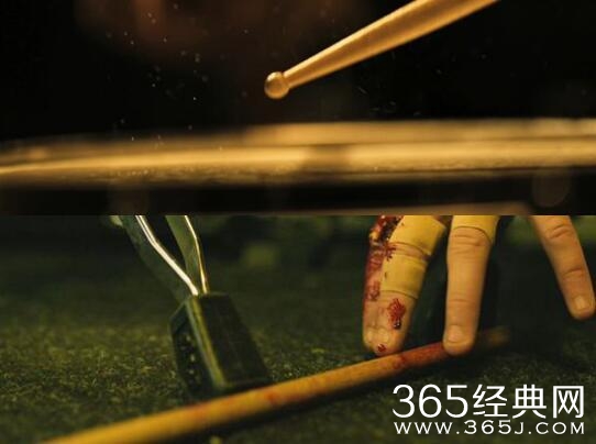 镜头运用上,《爆裂鼓手》常常利用特写镜头带来的情绪冲击力表现人物状态,尤其是当安德鲁敲鼓时,从震动的鼓面、到流血的鼓槌、汗湿的头发和人物神经质的表情,不断放大每个细节,安德鲁的偏执与癫狂,他的努力与挣扎,每一个情绪变化都在特写镜头下无所遁形。
